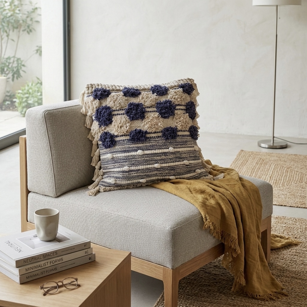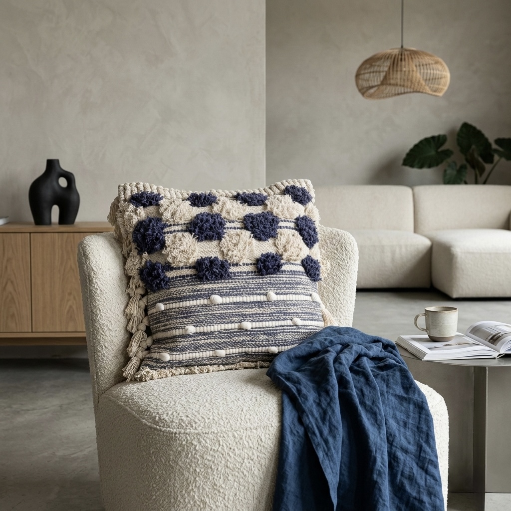 Funda Almohadón Rústico Natural con pompones azul