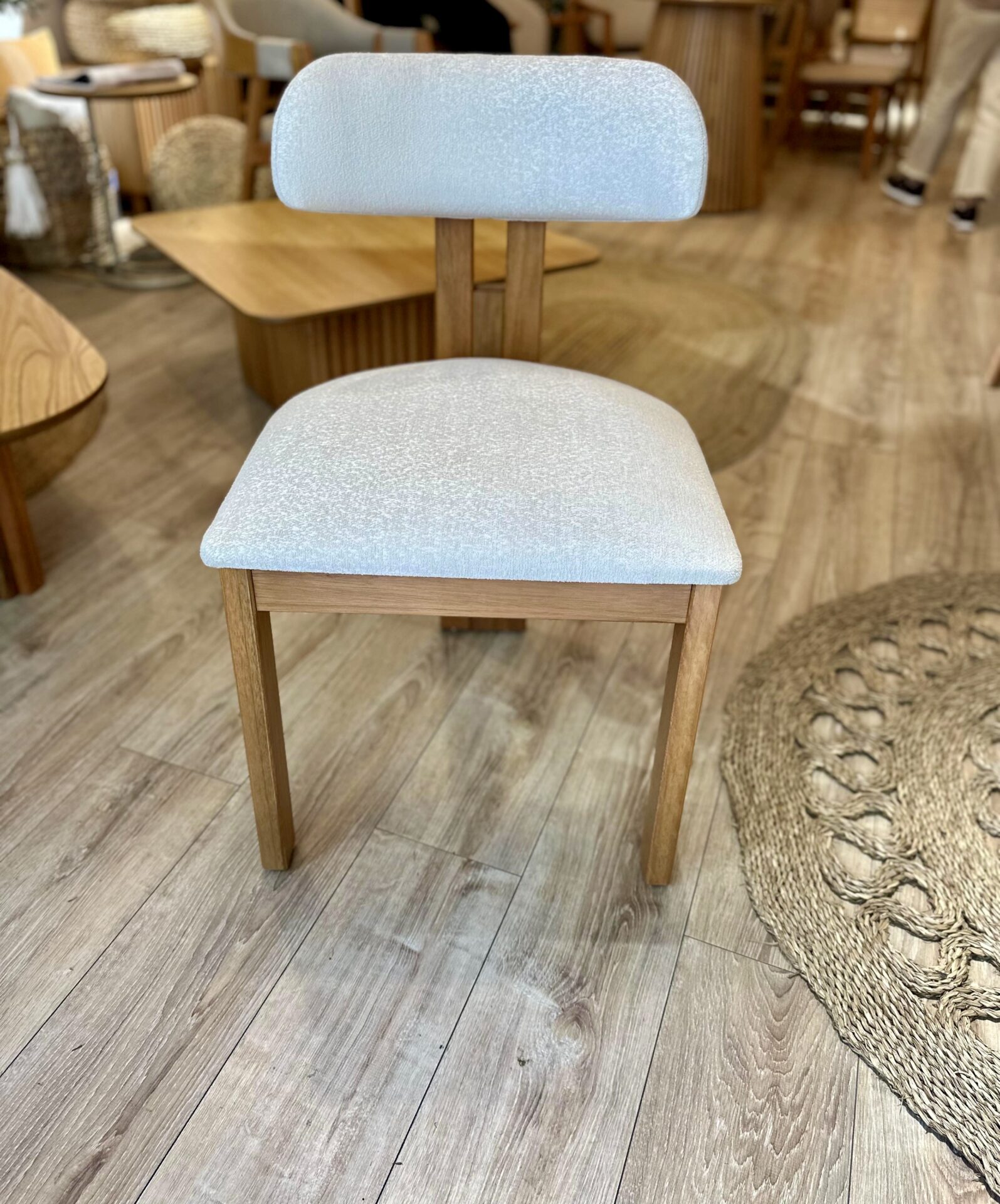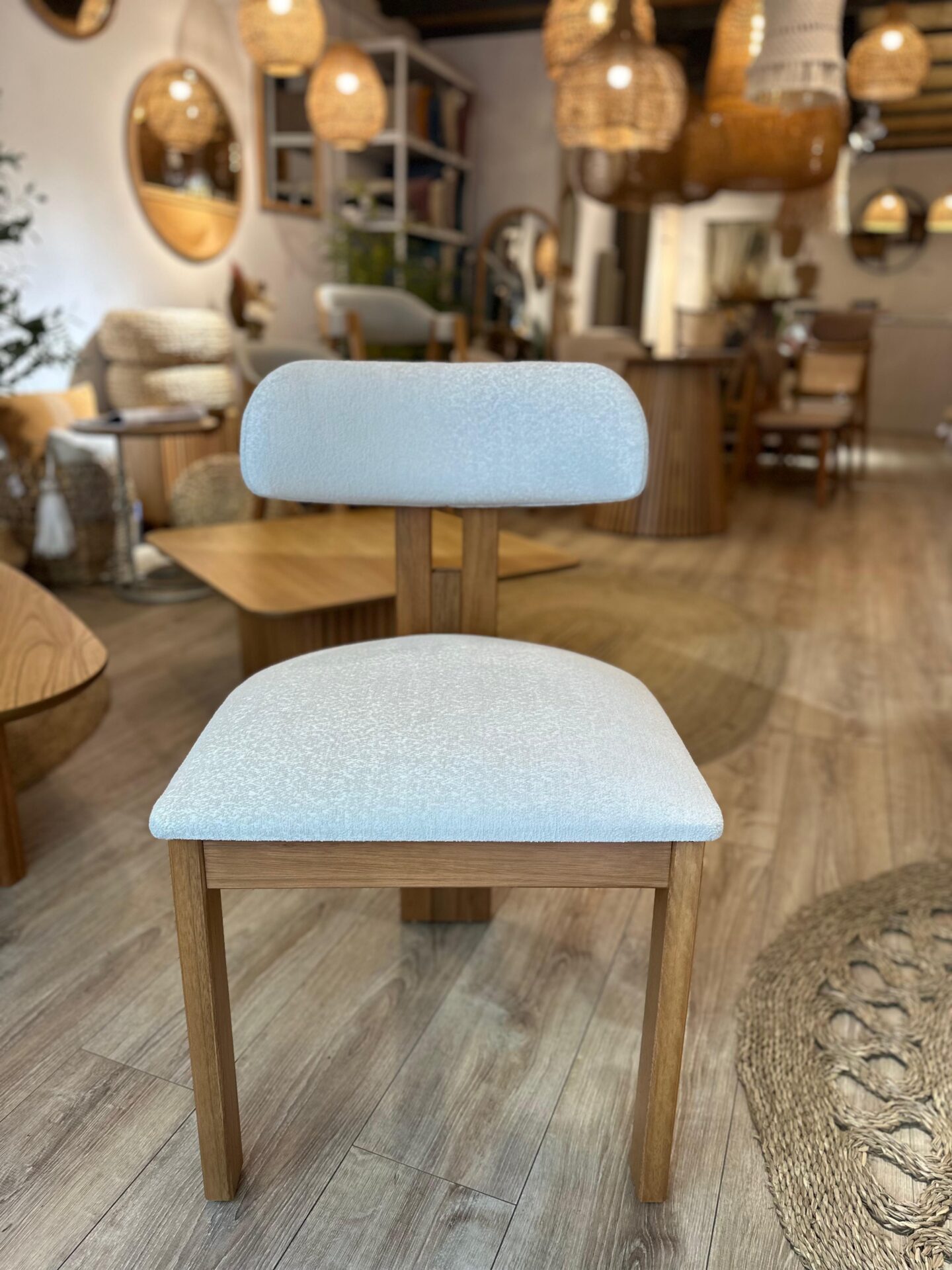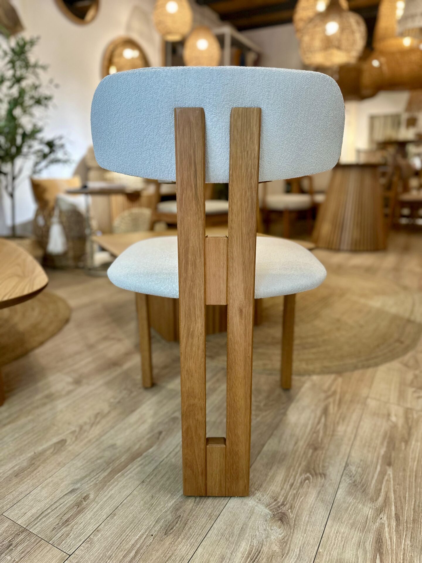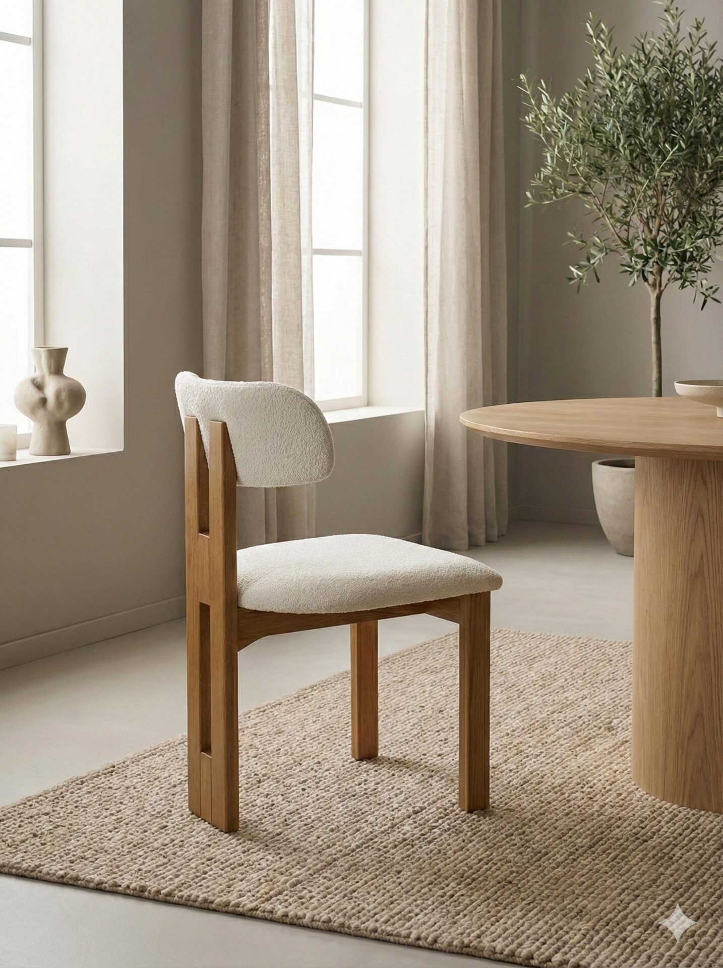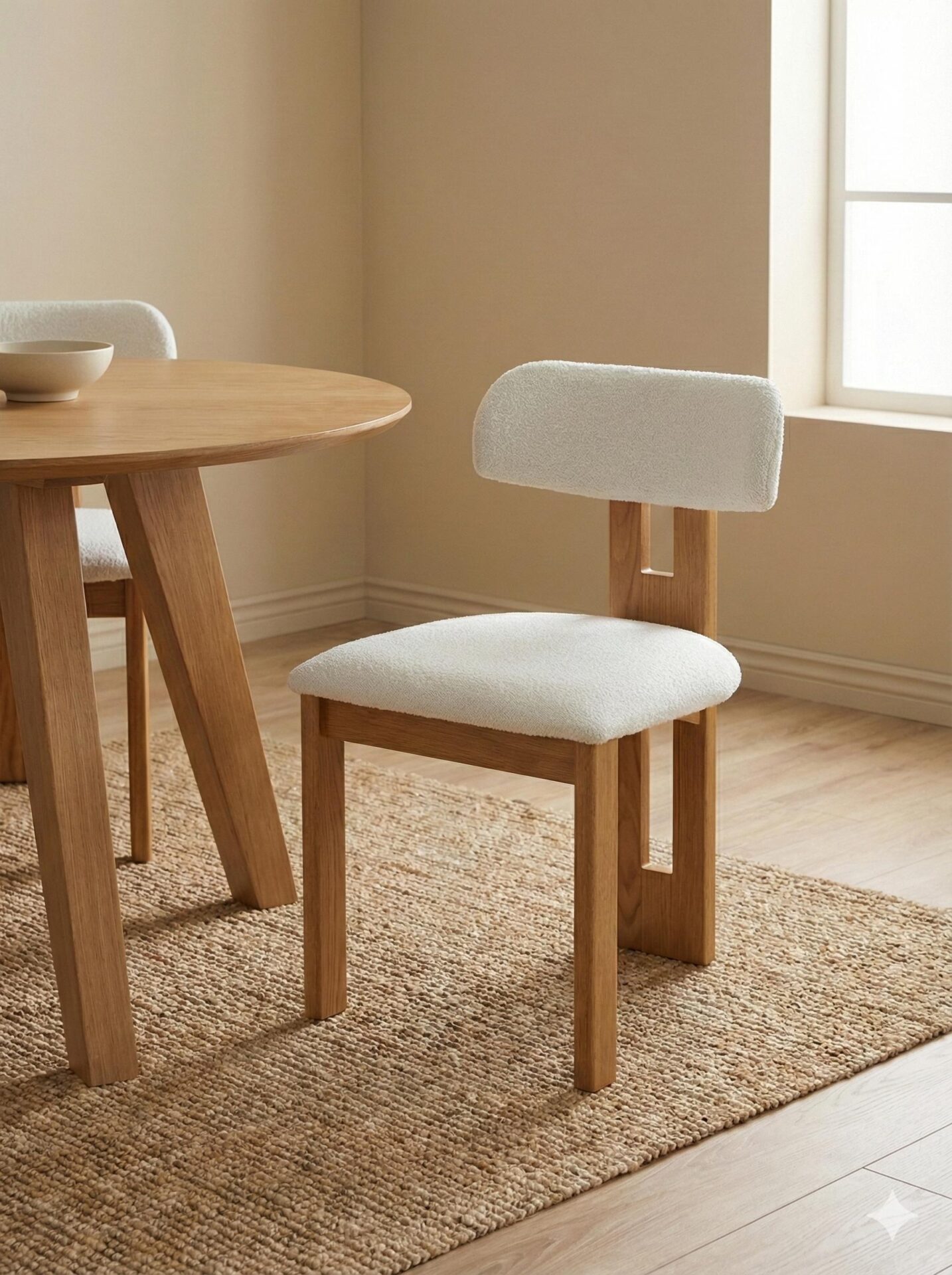 🧵 Asiento y respaldo tapizados en tejido Bouclé de alta calidad, con textura envolvente y tacto suave que invitan a disfrutar de cada momento a la mesa.